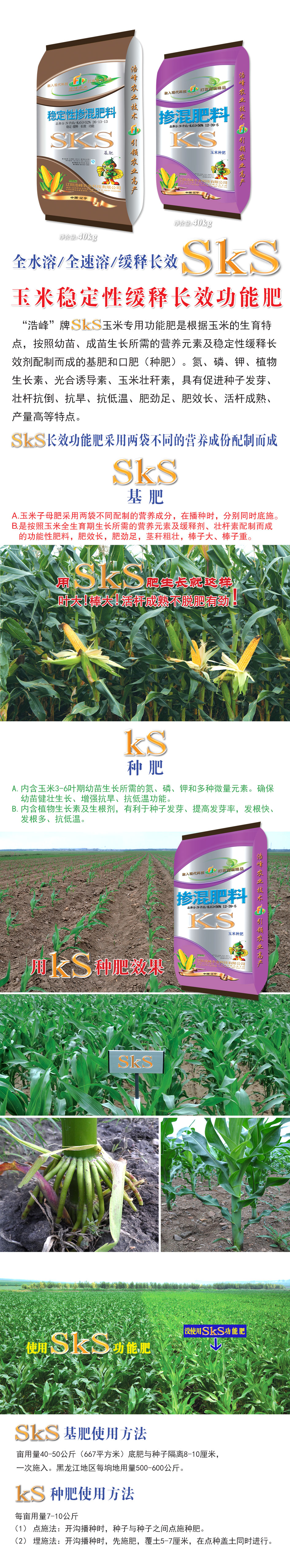 “浩峰”牌sks玉米專用功能肥是根據(jù)玉米的生育特點,按照幼苗、成苗生長所需的營養(yǎng)元素及穩(wěn)定性緩釋長效劑配制而成的基肥和口肥(種肥)。氮、磷、鉀、植物生長素、光合誘導(dǎo)素、玉米壯稈素,具有促進(jìn)種子發(fā)芽、壯桿抗倒、抗旱、抗低溫、肥勁足、肥效長、活桿成熟、產(chǎn)量高等特點。