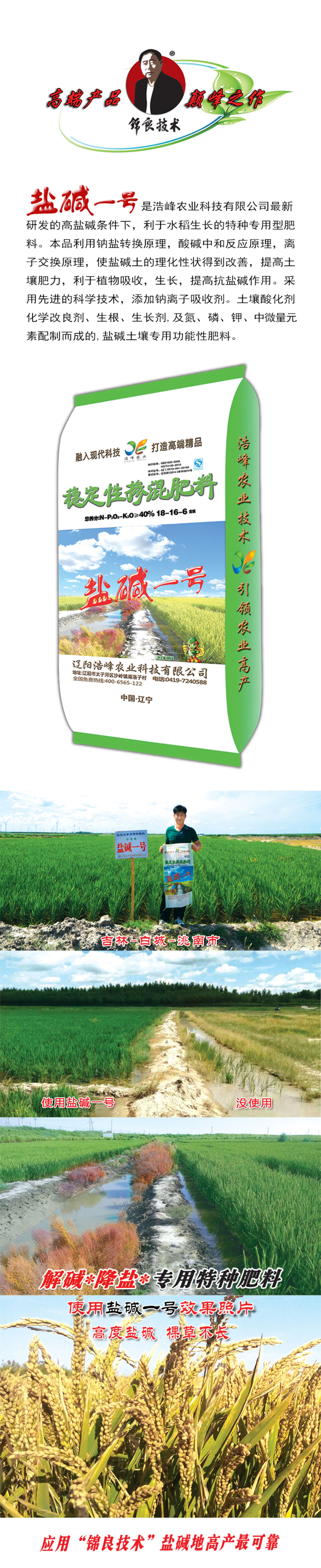 鹽堿一號是浩峰農(nóng)業(yè)科技有限公司最新研發(fā)的高鹽堿條件下,利于水稻生長的特種專用型肥料。本品利用鈉鹽轉(zhuǎn)換原理,酸堿中和反應(yīng)原理,離子交換原理,使鹽堿土的理化性狀得到改善,提高土壤肥力,利于植物吸收,生長,提高抗鹽堿作用。采用先進的科學(xué)技術(shù),添加鈉離子吸?。土壤藥F粱Ц牧技?、生根、生长?,及氮、磷、鉀、中微量元素配制而成的,鹽堿土壤專用功能性肥料。