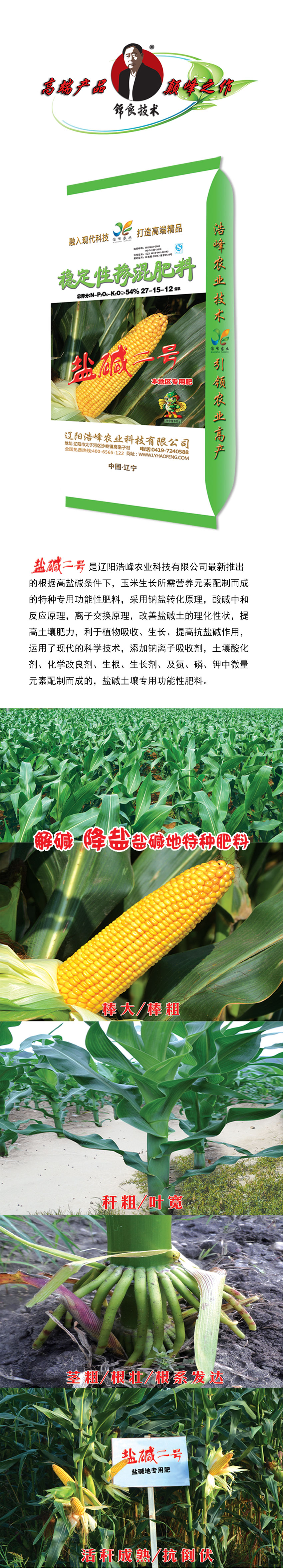 鹽堿二號是遼陽浩峰農(nóng)業(yè)科技有限公司最新推出的根據(jù)高鹽堿條件下,玉米生長所需營養(yǎng)元素配制而成的特種專用功能性肥料,采用鈉鹽轉(zhuǎn)化原理,酸堿中和反應(yīng)原理,離子交換原理,改善鹽堿土的理化性狀,提高土壤肥力,利于植物吸收、生長、提高抗鹽堿作用,運用了現(xiàn)代的科際?,添加脑u胱游占?,土壤藥F痢⒒Ц牧技?、生根、生长剂、及氮、磷、钾中微量元素配重汎成的,盐煎{寥雷ㄓ霉δ芐苑柿稀?