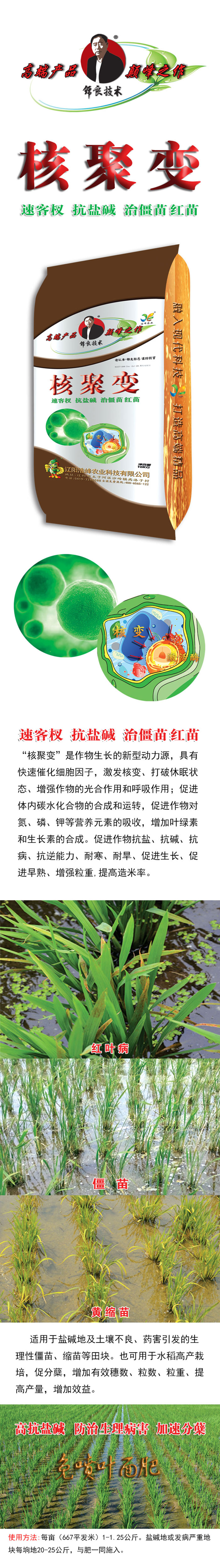 “核聚變”是作物生長的新型動力源,具有快速催化細(xì)胞因子,激發(fā)核變、打破休眠狀態(tài)、增強(qiáng)作物的光合作用和呼吸作用;促進(jìn)體內(nèi)碳水化合物的合成和運(yùn)轉(zhuǎn),促進(jìn)作物對氮、磷、鉀等營養(yǎng)元素的吸收,增加葉綠素和生長素的合成。促進(jìn)作物抗鹽、抗堿、宀?、抗逆能力、亩d?、亩d怠⒋俳?、促进钥r?、澡幙粒?,提高造米率。