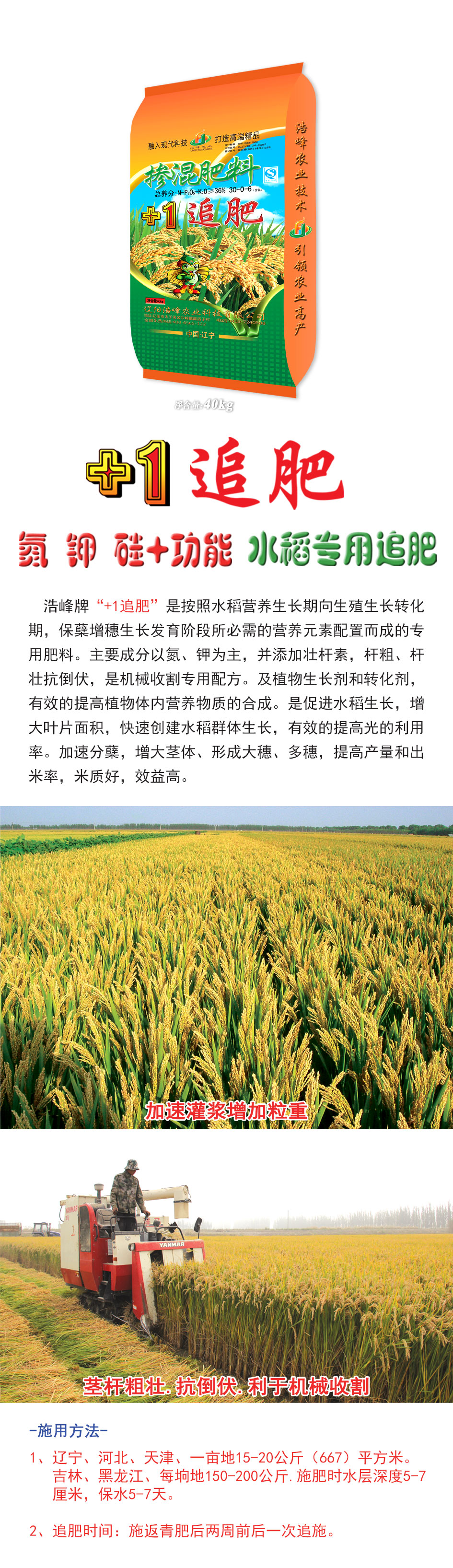 浩峰牌“+1追肥”是按照水稻營養(yǎng)生長期向生殖生長轉(zhuǎn)化期,保蘗增穗生長發(fā)育階段所必需的營養(yǎng)元素配置而成的專用肥料。主要成分以氮、鉀為主,并添加壯桿素,桿粗、桿壯抗倒伏,是機械收割專用配方。及植物生長劑和轉(zhuǎn)化劑,有效的提高植物體內(nèi)營養(yǎng)物質(zhì)ず銑傘J譴俳舊?,札e笠鍍婊?,繝F俅唇ㄋ救禾逕?,有效的提高光的利用率。尖欃分蘖,札e缶ヌ?、芯暭嗴穗、多穗,提高产量航y(tǒng)雒茁?,米质好,效益高?