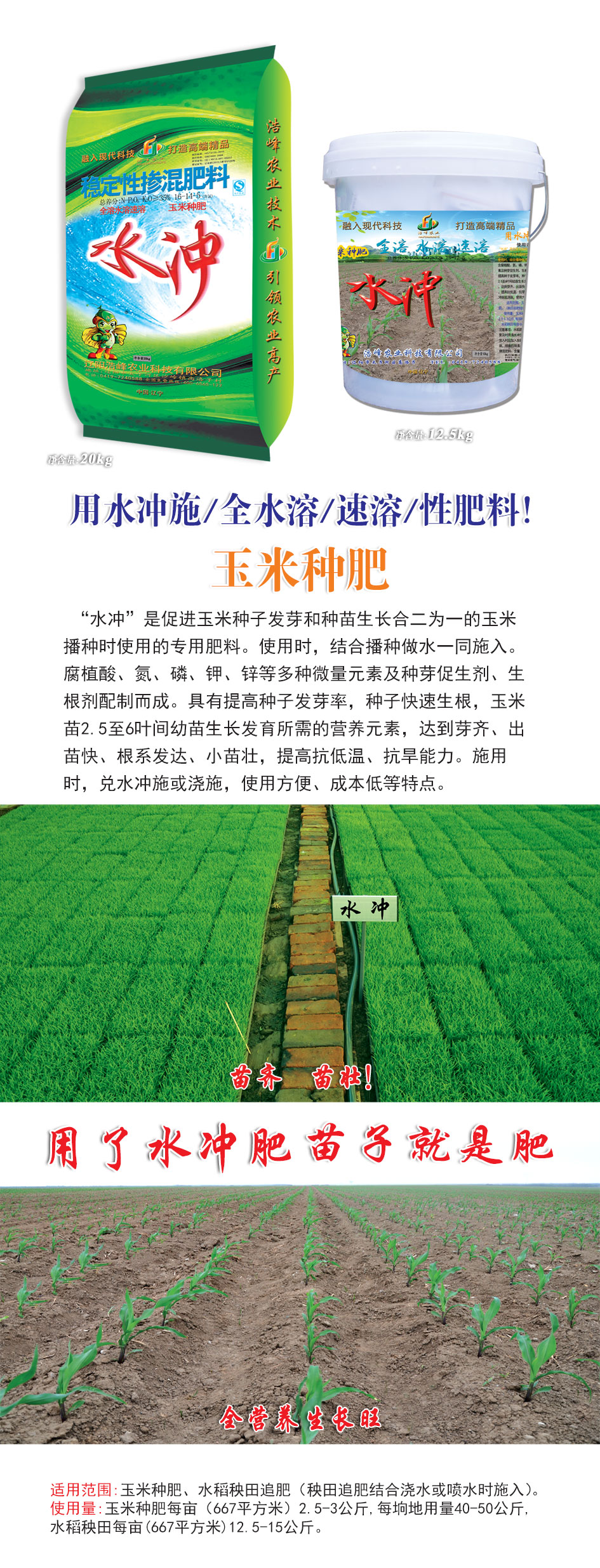 播種時使用的專用肥料。使用時,結合播種做水一同施入。腐植酸、氮、磷、鉀、鋅等多種微量元素及種芽促生劑、生根劑配制而成。具有提高種子發(fā)芽率,種子快速生根,玉米苗2.5至6葉間幼苗生長發(fā)育所需的營養(yǎng)元素,達到芽齊、出苗快、根系發(fā)達、小苗壯,提高抗低溫、抗旱辛?。施?